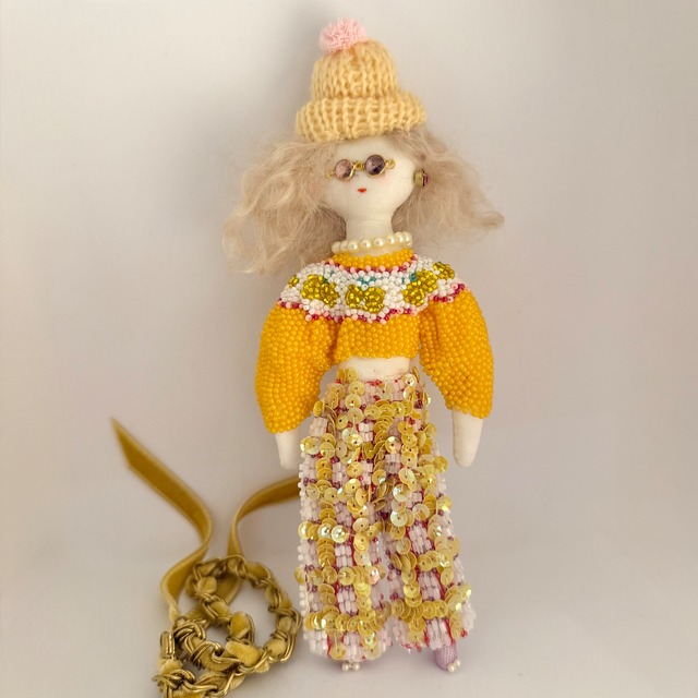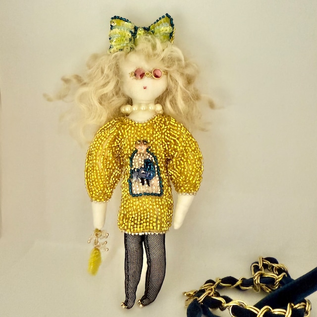 1点もののバックチャーム ドレスはビーズ刺繍で仕上げました。 足から頭まで針金入りなので お好きなポーズがお楽しみいただけます。 大きさ:約17cm