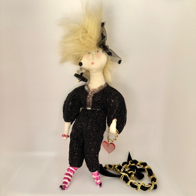 1点もののバックチャーム 頭から足先まで針金いりですので お好みのポーズでお楽しみいただけます。 ドレスは手作業のビーズ刺繍で仕上げてます。 大きさ:約18cm